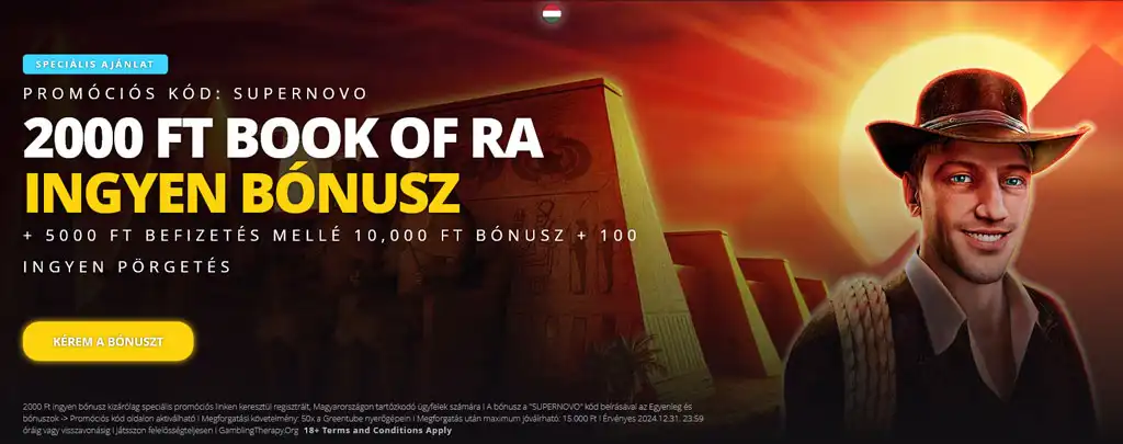 Az LV BET magyar játékosoknak 2000 Ft befizetés nélküli bónuszt kínál, amelyet a népszerű Book of Ra nyerőgépen használhatsz fel. A bónuszhoz tartozó megforgatási követelmény 50x, és a maximálisan kifizethető összeg 15.000 Ft. A promóció aktiválásához a SUPERNOVO promóciós kódot kell megadni a regisztráció vagy az egyenleg oldalán.