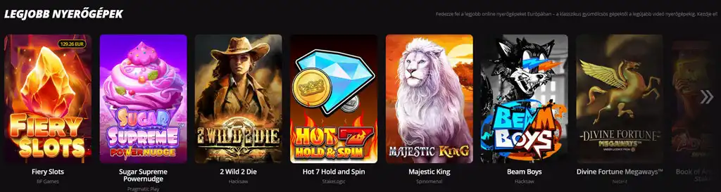 Nyertőgép szolgáltatók: Pragmatic Play, NetEnt, Microgaming, Play’n GO, Quickspin, Yggdrasil, Red Tiger, Big Time Gaming, Blueprint, Thunderkick, Nolimit City, Hacksaw Gaming, Relax Gaming, iSoftBet, Push Gaming.